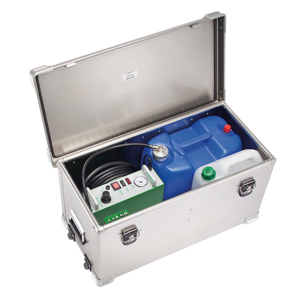 It has an electric pump and a continuously adjustable pressure regulator. If the container is completely emptied, the device switches off completely automatically. Purging of air is not required after changing the container.